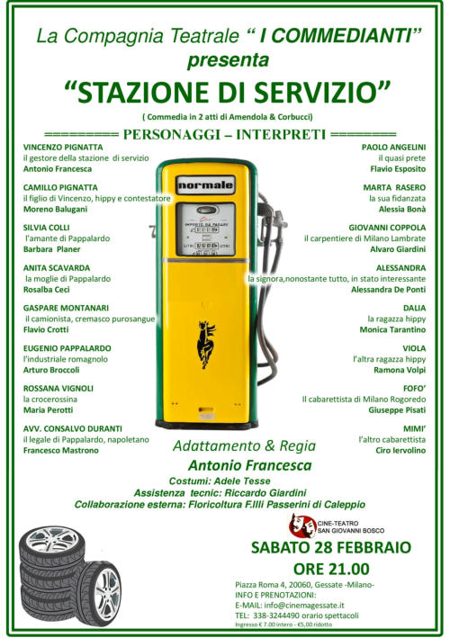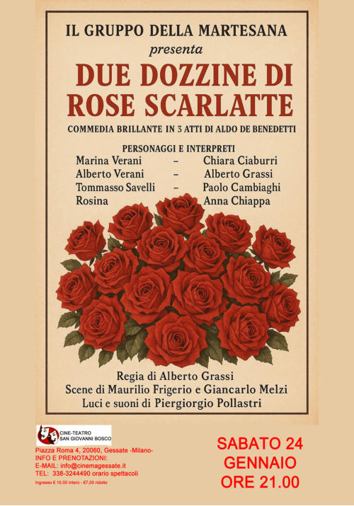 STAGIONE TEATRALE 2025-2026Sabato 18 ottobre ore 21.00La compagnia “More di gelso”Presenta:“Un onda di luce 4” Sabato 15 novembre ore 21.00La compagnia “More di gelso”Presenta:“Una regista in cerca di attori” Sabato 24 gennaio ore 21.00La compagnia “Martesana 2”Presenta:“Due dozzine di rose scarlatte” Sabato 28 febbraio ore 21.00La compagnia “I Commedianti”Presenta:“Stazione di servizio” Sabato 21 marzo ore 21.00La compagnia “Artorise”Presenta:“Serata DOC” Sabato 18 aprile ore 21.00La compagnia “Il Sottobosco”Presenta:“L’asso nella manica” Sabato 16 maggio ore 21.00La compagnia “Scombinati”Presenta:“Trappola per topi”